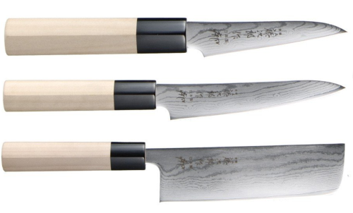 Très beaux couteaux de style traditionnel. La mitre en corne et le damas de la lame sont est très élégants. Les formes sont très pratiques pour les légumes et les fruits. Le couteau d'office a une forme droite plutôt originale mais est plus efficace que la forme classique. Le nakiri a la hauteur idéale, pas trop haut pour rester agile et pas trop bas pour pouvoir s'en servir de pelle.