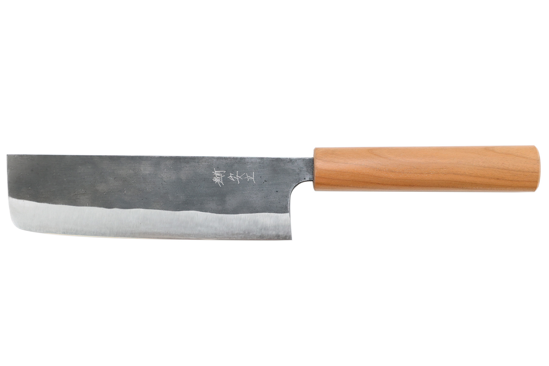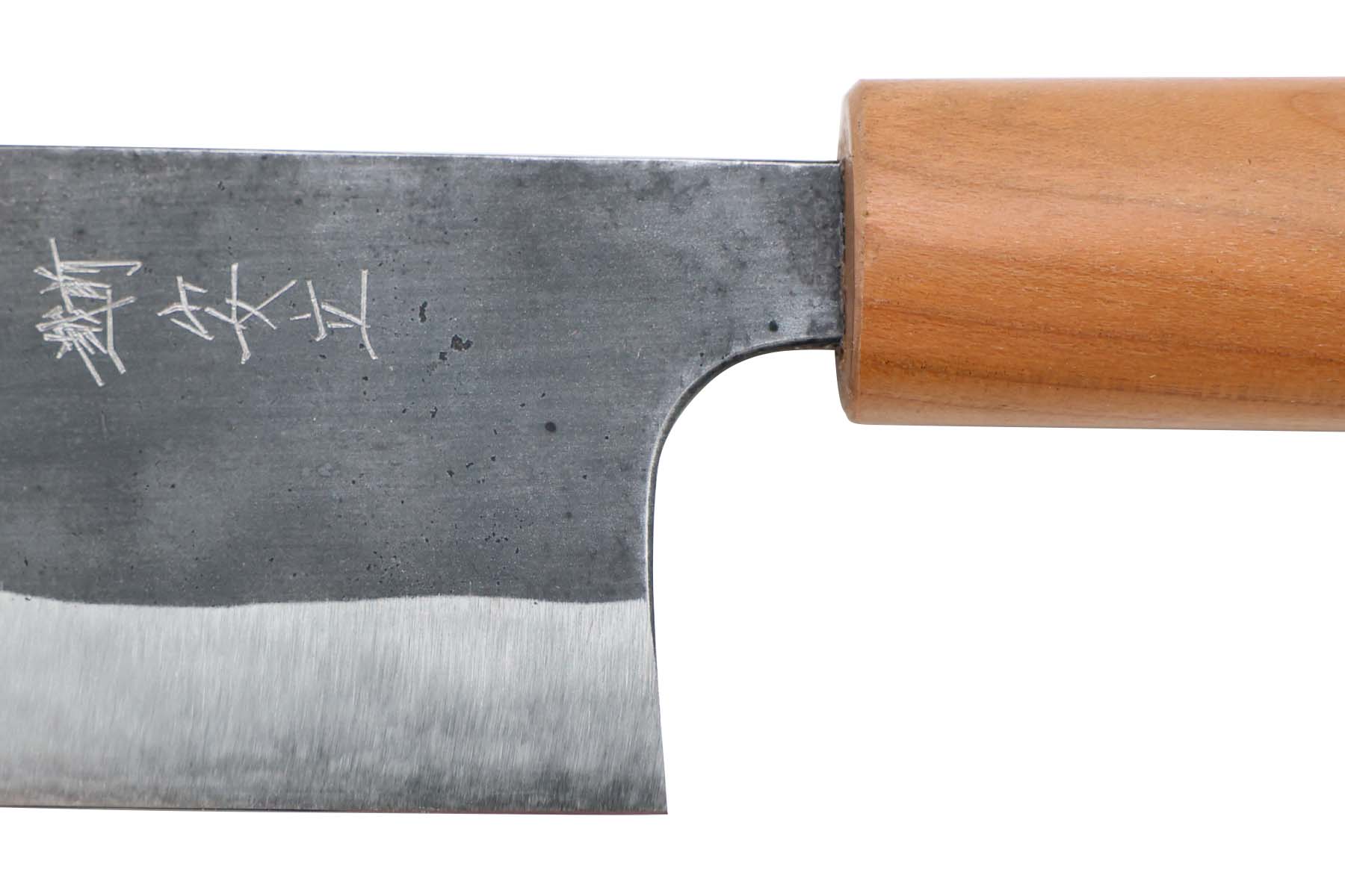 Lame forme nakiri en acier forgé aoko blue steel avec 3 couches et finition brut de forge sur le haut de la lame.