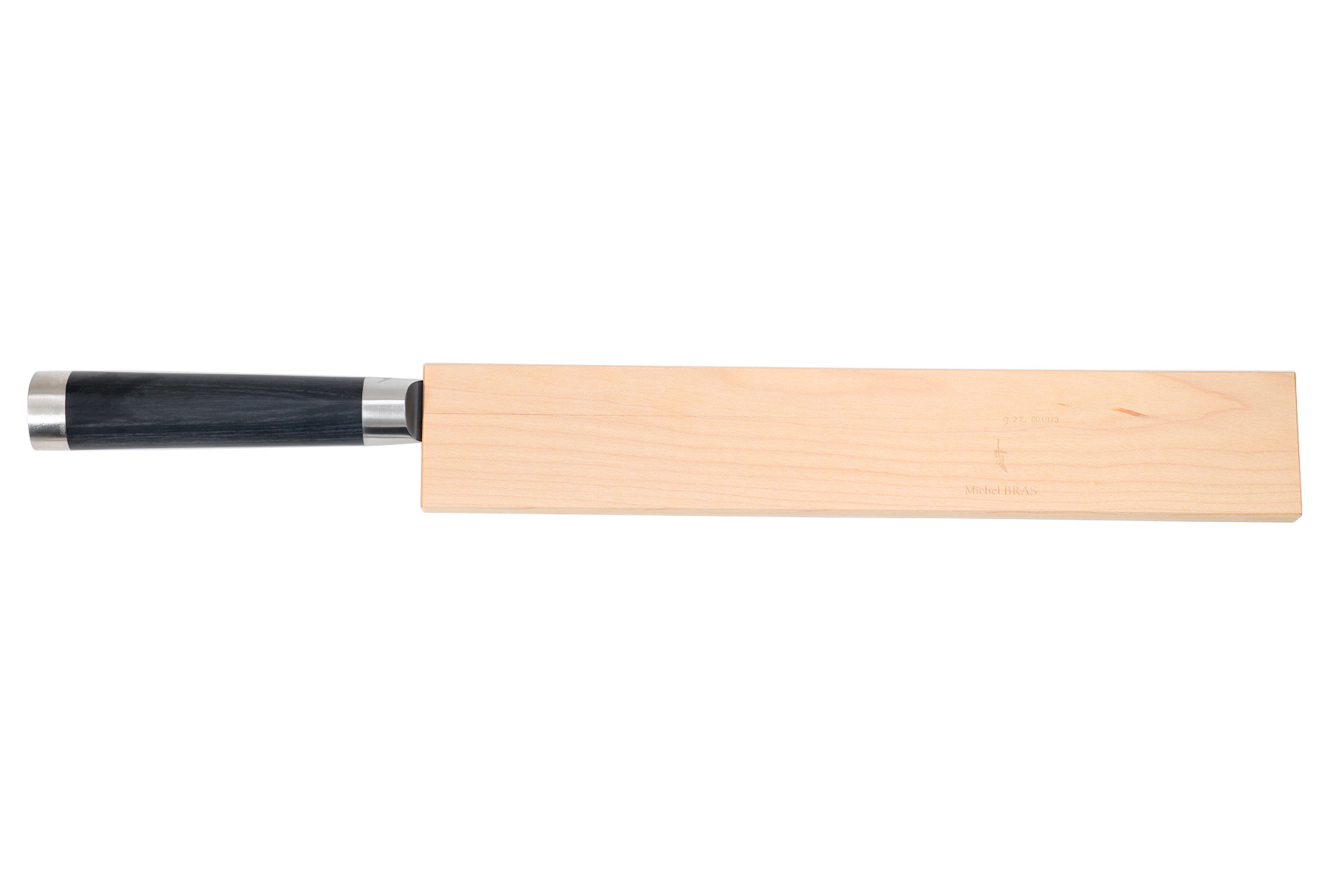 Les couteaux japonais Michel Bras sont livrés avec un fourreau en bois de protection de lame (saya en japonais) ainsi que d'un guide d’affûtage adapté à la lame.