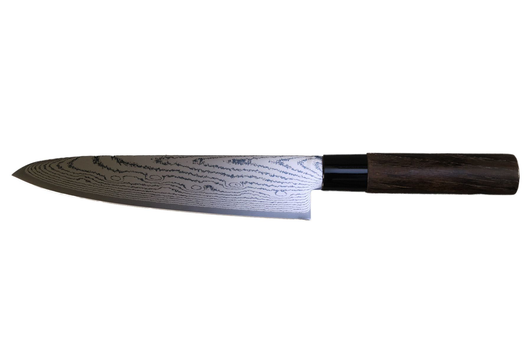 Nous vous proposons également ce couteau de chef dans la série Shippu de Tojiro avec un manche en chêne blanc ainsi qu'une lame en acier VG10 damassé.