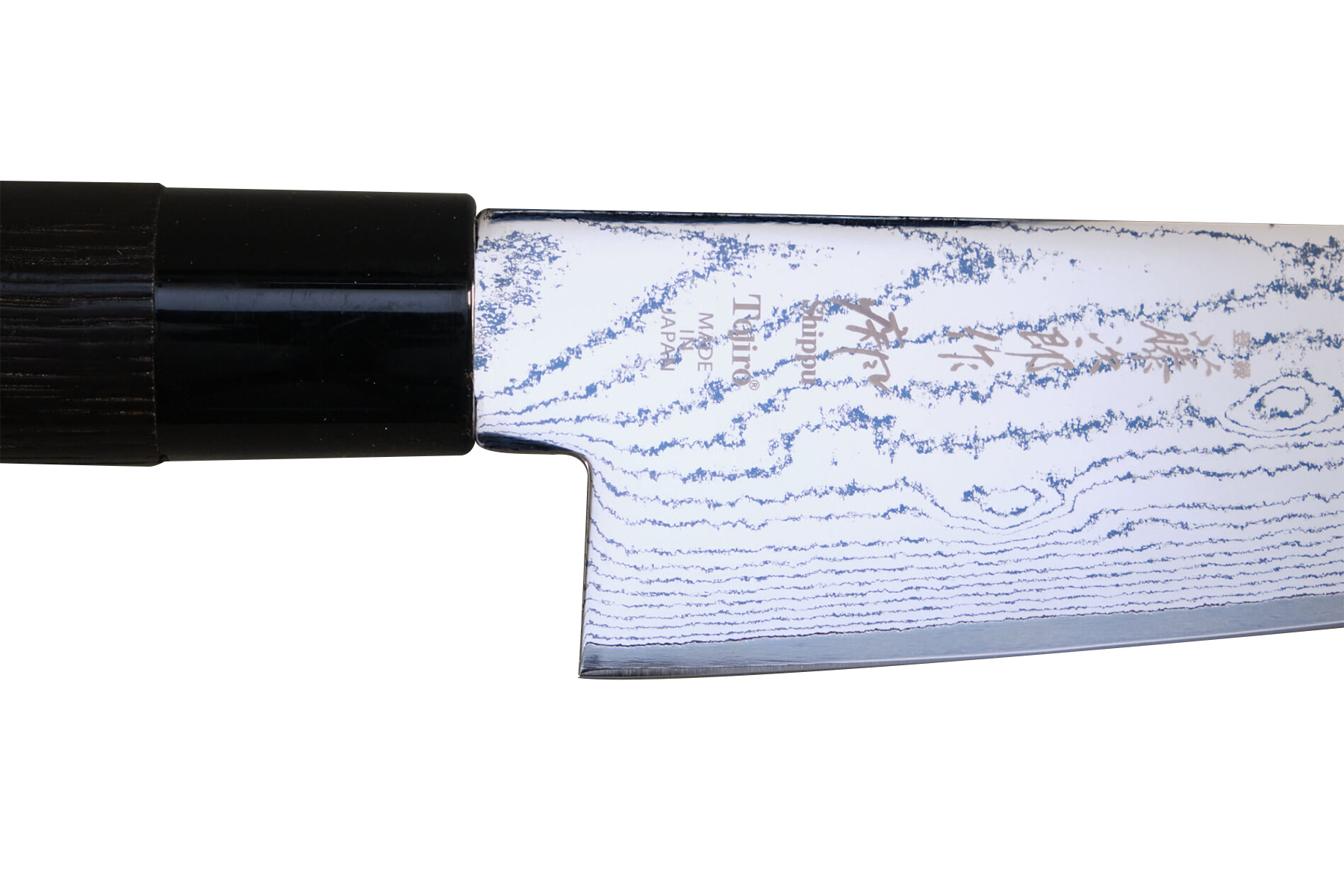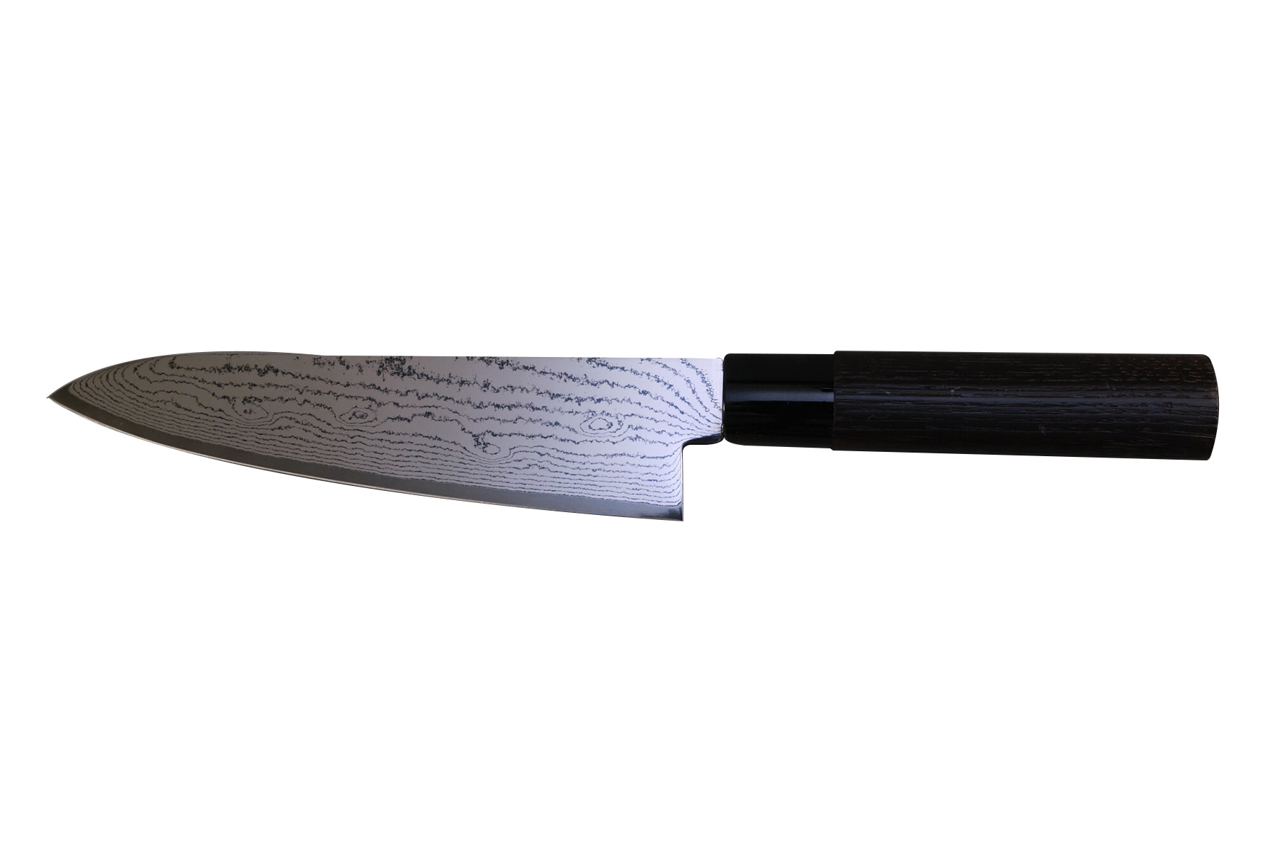 Nous vous proposons également ce couteau de chef dans la série Shippu de Tojiro avec un manche en chêne blanc ainsi qu'une lame en acier VG10 damassé.